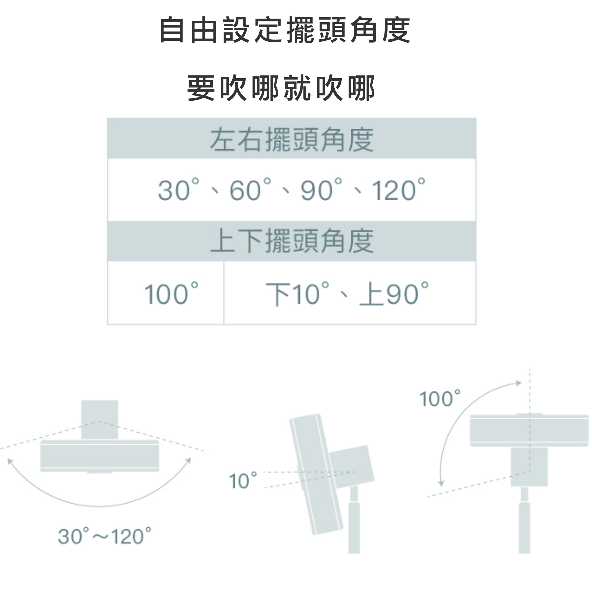 8段風量調整,左右擺頭可設定30°、60°、90°、120°,適合各種使用場景。